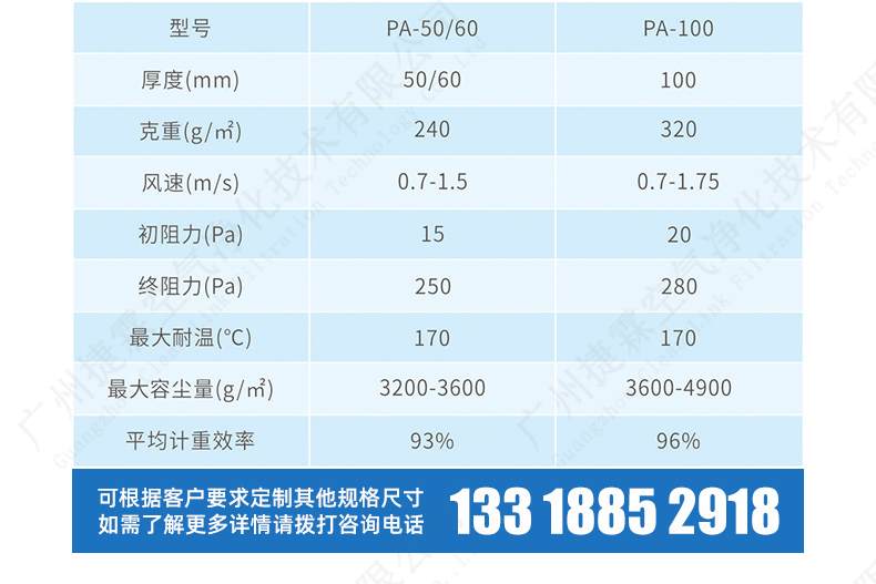 | 玻璃纖維過濾棉型號 | PA-50/60 | PA-100 |